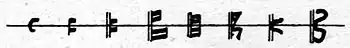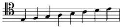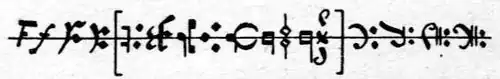- «F» (fa): representaba la clave de fa. En algún momento de su evolución, el signo estaba formado por tres pequeños cuadrados negros (la clave de do más un punto adicional).