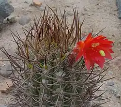 Cactus erecto, a veces cortamente decumbente, ramificado desde la base, con raíces gruesas y leñosas. Los tallos miden de 50 a 100 cm de alto y de 5 a 7 (-10) cm de diámetro. Tienen 14 a 19 costillas con muescas, 3-4 espinas centrales rectas o curvadas hacia arriba, gruesas y subuladas de 4-5 cm de largo y entre 16 a 22 espinas radiales aciculares de 1 cm de largo. Las espinas tienen una disposición característica en múltiples direcciones. Las flores son tubulares oblicuas de 6-7 cm de largo y de color rojo, producen frutos verdosos a marrón rojizos globulares e alrededor de 2-3 cm de diam.[2]