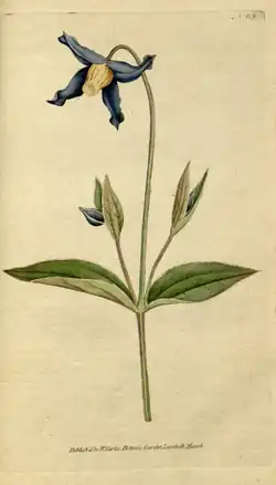 Es un subarbusto o hierba erecta, perennifolia, que alcanza un tamaño de 1 - 1,5 m de altura. Las ramas superficialmente con 6 - 10 ranuras, son pubérulas, glabrescentes, a menudo simples. Las hojas son simples, sésiles, con el limbo anchamente ovado, de 4 - 14 x 2,5 - 11 cm, papiráceas, redondeadas a ampliamente cuneadas, el margen entero y abaxialmente pubescentes el ápice agudo; las venas basales abaxialmente prominente. Las flores son solitarias, terminales, de 4 cm de diámetro.. Los sépalos en número de 4, son de color púrpura, azul o blanco, de 3 a 4,5 × 0,7 - 1,2 cm. Los frutos son aquenios estrechamente obovados, de 6 - 10 × 4 a 5 mm, pubérulos. Fl. junio-julio, fr. agosto.[1]