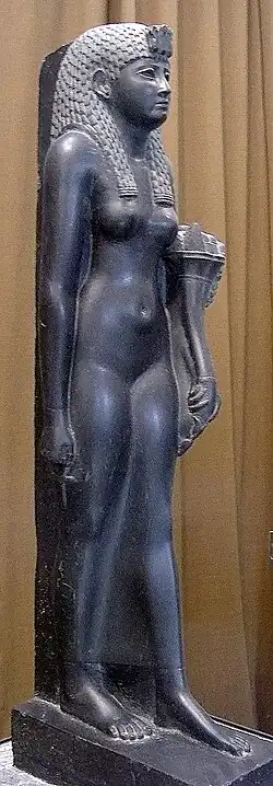 Escultura romana de Cleopatra con una diadema real, de mediados del siglo I a. C. (época de sus visitas a Roma en 46-44 a. C.) encontrada en una villa italiana en la Vía Apia, actualmente expuesta en el Altes Museum.[1][2][3][n 1]