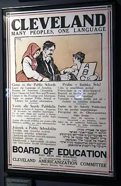 Además de la gran población de inmigrantes, los afroamericanos del Sur rural llegaron a Cleveland (entre otras ciudades del noreste y del medio oeste) como parte de la Gran Migración en busca de empleo, derechos constitucionales y alivio de la discriminación racial.[36] Entre 1910 y 1930, la población afroamericana de Cleveland creció más del 400 %.[37] Para 1920, el año en que los Cleveland Indians (actualmente, Cleveland Guardians) ganaron su primer campeonato de la Serie Mundial, Cleveland se había convertido en una metrópolis densamente poblada de 796 841 habitantes, convirtiéndola en la quinta ciudad más grande de la nación, con una población nacida en el extranjero del 30 %.[38][39] En este momento, Cleveland vio el surgimiento de movimientos laborales radicales, más prominentemente los Industrial Workers of the World (IWW), en respuesta a las condiciones de los trabajadores en su mayoría inmigrantes y migrantes. En 1919 atrajo la atención nacional en medio del Primer Susto Rojo por los disturbios del Primero de Mayo de Cleveland, en los que los socialistas locales y los manifestantes del IWW se enfrentaron con los antisocialistas.[40][41]