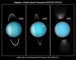 La fotometría a lo largo de medio año uraniano (desde la década de 1950) mostró una variación regular del brillo en dos bandas espectrales, con máximos en los solsticios y mínimos en los equinoccios.[11] Una variación periódica similar, con máximos en los solsticios, se observó en mediciones de microondas de la troposfera profunda iniciada en la década de 1960.[12] Las mediciones de temperatura estratosférica a partir de la década de 1970 también mostraron valores máximos cerca del solsticio de 1986.[13] La variabilidad se produce posiblemente a cambios en la geometría de visualización, por la forma esferoide del planeta, que hace que su área visible se vea más grande cuando se ve desde los polos.[11]