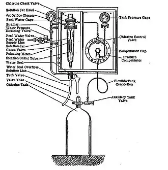 La técnica de purificación de agua potable mediante el uso de cloro gaseoso licuado comprimido fue desarrollada por un oficial británico del Servicio médico indio, Vincent B. Nesfield, en 1903. Según su propio relato: "Se me ocurrió que el cloro gaseoso podría resultar satisfactorio... si se encontraran medios adecuados para utilizarlo... La siguiente cuestión importante era cómo hacer que el gas fuera portátil. Esto podría lograrse de dos maneras: licuándolo y almacenándolo en vasijas de hierro revestidas de plomo, con un chorro de capilar muy fino, y provistas de un grifo o tapón de rosca, se abre el grifo y se coloca el cilindro en el "La cantidad de agua necesaria. El cloro burbujea y en diez o quince minutos el agua es absolutamente segura. Este método sería útil a gran escala, como para los carros de agua de servicio".[9]