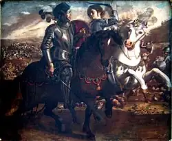 Con séquito bizarro el jóven era; Cuando en aspecto grato y peregrino, Se le ofreció á su vista la guerrera; Blanca mas que la nieve en cerro Alpino Tiene la sobrevesta, y la visera Tan alta sube, que el semblante bello
