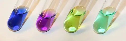Color de diversas concentraciones de Ni(II) en solución acuosa. De izquierda a derecha, [Ni (NH 3 ) 6 ] 2 + , [Ni (etilendiamina es ) 3 ] 2 + , [NiCl 4 ] 2 - , [Ni (H 2 O) 6 ] 2 +