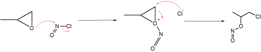 Los epóxidos reaccionan con NOCl para dar derivados de α-cloronitritoalquilo. En el caso del óxido de propileno, la adición ocurre con alta regioquímica.[11]
