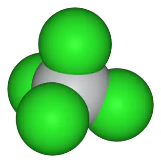 El Ti 4 + tiene una estructura electrónica "cerrada", con el mismo número de electrones como el gas inerte argón. La estructura tetraédrica del TiCl4 es coherente con su descripción como una simetría d0 con un centro metálico (Ti4 + ) rodeado por cuatro enlaces idénticos. Esta configuración conduce a estructuras altamente simétricas, por lo tanto la forma tetraédrica de la molécula. El TiCl4 adopta estructuras similares a TiBr4 y TiI4 , los tres compuestos comparten muchas similitudes. El TiCl4 y el TiBr4 reaccionan para dar haluros mixtos TiCl4 -xBrx, donde x = 0, 1, 2, 3, 4. Mediciones de resonancia magnética también indican que el intercambio de haluro es también rápida entre TiCl4 y VCl4.[2]