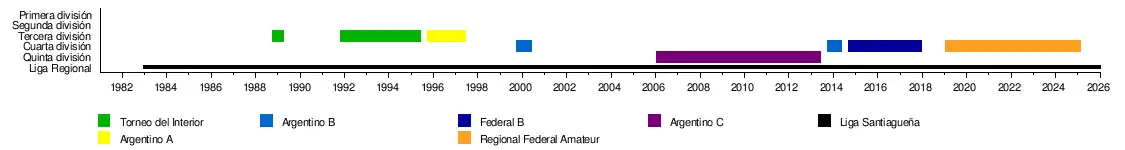 Anteriormente, en cuanto a competición nacional, tuvo 3 participaciones de la Copa Argentina desde la temporada 2013-2014 hasta la 2015-2016,[4]​ en el Torneo Federal C y Torneo Federal B la cuales se fusionaron para formar el Torneo Regional Federal Amateur donde actualmente participa y también estuvo en el Torneo Argentino A donde solo participó en 2 temporadas.