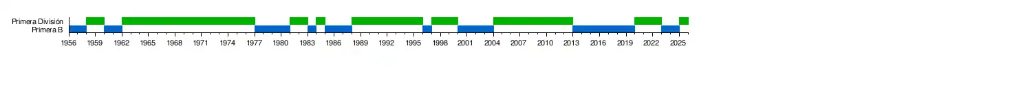 Ya en Primera, el club permaneció en posiciones medias y no pudo aspirar a un campeonato o a pelear por un cupo para una copa internacional. En 1997, cuando el torneo fue dividido en dos etapas (Apertura y Clausura) no superó el noveno puesto, aunque en la tabla acumulada tampoco tuvo peligro de caer a Primera B.[32] En 1998 también finalizó en el noveno puesto, pero esta vez bajo un formato de campeonato anual.[33]