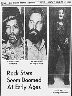 Comenzando con la muerte de varios músicos populares de 27 años entre 1969 y 1971, morir a los 27 se convirtió y sigue siendo un tema perenne de la cultura popular, el periodismo de celebridades y la industria del entretenimiento.[1][2] Este fenómeno cultural, que llegó a conocerse como el «Club de los 27», atribuye un significado especial a los músicos, artistas, actores y otras celebridades populares que fallecieron a los 27 años, a menudo como resultado del abuso de drogas y alcohol o medios violentos como homicidio, suicidio o accidentes de tráfico.[6] Se han dedicado varias exposiciones a la idea, así como novelas, películas y obras de teatro.[7][8][5][9] El fenómeno cultural también dio lugar al mito urbano de que las muertes de celebridades son más comunes a los 27 años, afirmación que ha sido refutada por investigaciones estadísticas.[10][4]
