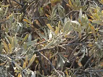 - Se trata de un arbusto de hasta 1,5 metros. Tiene un característico color blanco-grisáceo debido a los pelos cortos que cubren densamente hojas y tallos. Dichos pelos son medifijos (sujetos por su mitad de modo que salen como dos ramas).