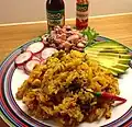 El casado es un plato muy popular y gustado por los costarricenses, se puede encontrar en el menú de prácticamente cualquier restaurante o soda y en muchas casas.[63]​ Por lo general se consume durante la hora del almuerzo, y consiste en arroz hervido (domina el blanco aunque también se puede comer con arroz integral) y aromatizado con cebolla, ajo, pimientos (conocidos como chiles dulces) y/o culantro; acompañado con frijoles (condimentados con ajo, cebolla, pimientos, apio y culantro), ensalada jardinera, plátano maduro frito, pasta (generalmente macarrones en salsa de tomate y/o ensalada fría), huevo (frito, revuelto, duro o en ensalada rusa), picadillos o vegetales (hervidos, en puré o al vapor) y alguna ración de carne (res, embutidos, cerdo, pollo o pescado).[4]​ Existen también versiones vegetarianas con berenjena, queso o sustitutos de soya.[63]