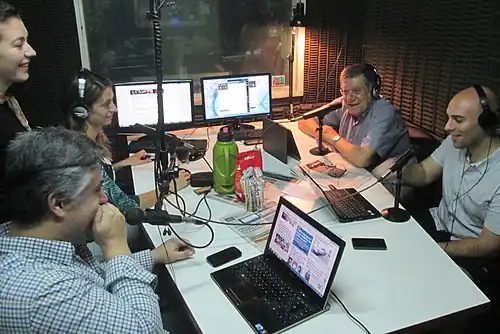 Coco López dirige a su equipo de periodistas en el programa radial Rompiendo los cocos, en Radio Universidad Rosario. Fotografía del 19 de agosto de 2015.