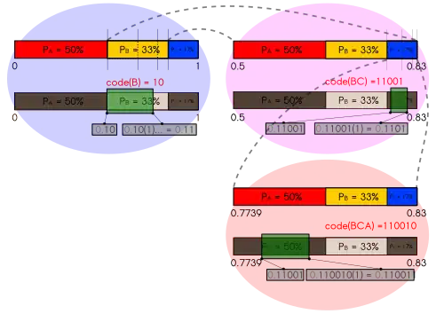 En el paso uno codificamos "B", el cual está dentro del intervalo [0.5, 0.83): el número binario "0.10x" es el código más corto que representa un intervalo que está enteramente dentro de [0.5, 0.83). "x" significa una secuencia de bits arbitraria. Hay dos casos extremos: la x más pequeña representa un número infinito de ceros, lo cual representa el lado izquierdo del intervalo representado. Luego el lado izquierdo del intervalo es dec(0.10) = 0.5. La x más grande representa un número infinito de unos lo cual da un número que converge hacia dec(0.11) = 0.75. Por lo tanto, "0.10x" representa el intervalo [0.5, 0.75) el cual está dentro de [0.5, 0.83).