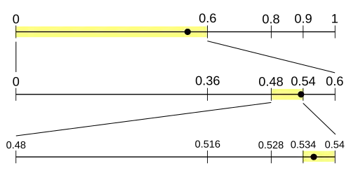 Considere el proceso para decodificar un mensaje codificado con el modelo de cuatro símbolos dado. El mensaje es codificado en la fracción 0.538 (usando decimal para claridad, en lugar de binario; también asumiendo que hay sólo tantos dígitos como se necesitan para decodificar el mensaje).