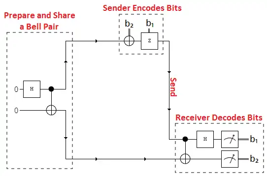 La figura que se tiene a la derecha representa un circuito cuántico, simbolizando las operaciones seguidas en la codificación superdensa. La primera parte consiste en entrelazar los qubits de Alice y Bob, el cual en este proceso ya se ha supuesto como condición inicial, pero se puede ver en el proceso de teleportación cuántica, aplicando un operador CNOT y de Hadamard. En la segunda parte Alice codifica los dos bits en un qubit, representado por los operadores (el círculo en ) y (el cuadrado en ). Por último, una vez que Bob ya tiene los dos qubits, este realiza una puerta CNOT para desentrelazar los dos qubits, representada por la línea conectando los dos qubits, y una operador de Hadamard sobre el qubit de Alice (representado por el cuadrado con ). Los últimos dos cuadrados con un segmento de curva y una flecha atravesándolo se interpretan como una medida, obteniendo los bits que Alice quería enviar.