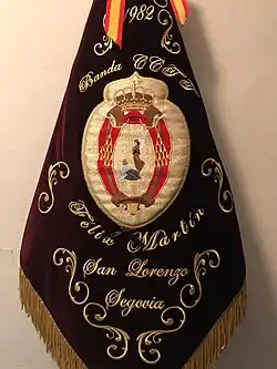 Los miembros de la banda desfilan con hábito de terciopelo rojo burdeos y con detalles en blanco; capucha del mismo color con el escudo de la cofradía bordado y cíngulo blanco.
