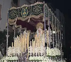El paso de palio es obra de orfebrería Villareal de Sevilla. El manto y las bambalinas fueron bordadas por Teresa Degiuli, mientras que el techo y los faldones lo fueron por Javier García y Martín Suárez. La corona de la Virgen es también de Villareal.