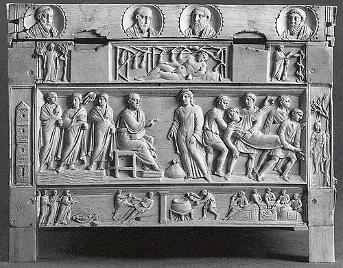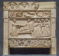 Está cubierto con una profusión de pequeñas escenas religiosas talladas en relieve sobre marfil, extraídas tanto del Antiguo como del Nuevo Testamento. La tapa, que puede considerarse la cara más importante de una caja pequeña como ésta, presenta los relieves más grandes, con cinco escenas de la Pasión de Cristo en dos registros, y un pequeño registro superior con un friso de pájaros. Los cuatro lados siguen un diseño con un registro medio que contiene temas relativamente extensos del Nuevo Testamento. Arriba y debajo hay registros más estrechos con escenas del Antiguo Testamento, y en las esquinas estrechas imágenes verticales, solo una que contiene una figura humana, el resto objetos simbólicos. La parte superior de las caras laterales está rematada con un registro, en realidad los laterales de la tapa, de bustos de figuras masculinas en marcos redondos (clipea) ligeramente aplanados. Faltan dos de ellos; Originalmente habría un total de 17, cinco en el frente, cuatro en la parte trasera y cuatro (ahora falta uno) en cada lado. Se acepta que un Jesús joven e imberbe ocupa el centro del panel frontal, y probablemente esté rodeado por los Doce Apóstoles, con San Pablo sustituyendo a Judas, lo que suma 13. Se presume que los santos Pedro y Pablo son los dos hombres mayores con largas barbas que flanquean a Jesús. Las cuatro cabezas restantes, presumiblemente las de la cara posterior, podrían ser las de los Cuatro Evangelistas, lo que significaría repetición de temas, u otros santos.[10]