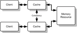 Cuando los clientes de un sistema, en particular las CPUs en un multiprocesador, mantienen cachés de una memoria compartida, los conflictos crecen. Haciendo referencia al dibujo, si el cliente de arriba tiene una copia de un bloque de memoria de una lectura previa y el cliente de abajo cambia ese bloque, el cliente de arriba podría estar trabajando con datos erróneos, sin tener conocimiento de ello. La coherencia de la caché intenta administrar estos conflictos y mantener consistencia entre las cachés y la memoria.