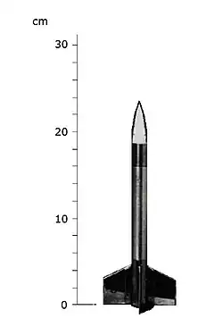 El cohete pesaba apenas 200 gramos, con 1,8 cm de diámetro y 23 cm de longitud. Se lanzaba en posición horizontal, empleando una plataforma de despegue de 1,5 m de altura. En las pruebas, volaba atravesando algunas pantallas de papel hasta alcanzar una bolsa de arena, situada a cierta distancia. La velocidad del cohete se calculaba a través del análisis de las rasgaduras en las pantallas de papel con la ayuda de un estroboscopio y cámaras de alta velocidad.[2]