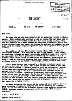 "Durante algún tiempo nos han preocupado los informes recurrentes sobre platillos voladores. Periódicamente continúan apareciendo; durante la última semana, se observó a uno flotando sobre la Base Aérea de Neubiberg durante unos treinta minutos. Han sido reportados por muchas fuentes y de tal variedad de lugares que estamos convencidos de que no pueden ser ignorados y deben explicarse sobre una base que tal vez esté un poco más allá del alcance de nuestro pensamiento de inteligencia actual. Cuando los oficiales de esta Dirección visitaron recientemente el Servicio Sueco de Inteligencia Aérea, se les hizo esta pregunta a los suecos. Su respuesta fue que algunas personas confiables y totalmente cualificadas llegaron a la conclusión de que estos fenómenos son obviamente el resultado de una alta habilidad técnica que no puede acreditarse a ninguna cultura actualmente conocida en la tierra. Por lo tanto, están asumiendo que estos objetos se originan de alguna tecnología previamente desconocida o no identificada, posiblemente fuera de la Tierra".