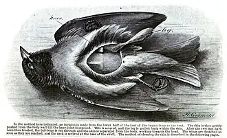 Las técnicas de conservación de aves se intentaron incluso desde principios del siglo XVI, como demuestran los escritos de Conrad Gesner y Pierre Belon. Belon dio instrucciones sobre la extracción de vísceras y el uso de sal para conservar especímenes de aves en su libro de 1555 sobre las aves. En el siglo XVII se perfeccionaron estas instrucciones y se utilizaron diversos conservantes, como ceniza (carbonato potásico), sal, azufre, alumbre, alcohol y diversos extractos de plantas.[15] En los primeros tiempos de las colecciones de aves, la mayoría de los especímenes se montaban en posiciones poco realistas, a menudo con las alas levantadas como si estuvieran a punto de emprender el vuelo. Se conservaban a la intemperie y los colores eran propensos a desteñirse y los propios especímenes a sufrir daños por escarabajos. En Berlín, J. L. Frisch empezó a utilizar frascos de cristal herméticamente cerrados para cada montaje con el fin de evitar los daños de las plagas. En esta época, el Conde de Reaumur, en el Museo de París, había conseguido encontrar técnicas para conservar los especímenes secos y sin pérdida de color.[16][17] Sin embargo, esta técnica era un secreto y más tarde se consiguieron resultados similares encurtiendo con sal, pimienta molida y alumbre y secando durante un mes con hilos que sujetaban el ave en posición natural. El uso de arsénico para conservar especímenes fue introducido por primera vez por Jean-Baptiste Bécoeur (1718-1777), pero este método no fue revelado públicamente hasta 1800 por Louis Dufresne en el Traité Élémentaire et Complet d'Ornithologie de Daudin (1800).[18] En las colecciones modernas, las aves recuperadas o recogidas pueden conservarse de varias maneras. La preparación más tradicional es una piel de estudio, en la que se retira casi todo el cuerpo del interior de la piel y se sustituye por algodón, de modo que el resultado final se asemeja a un ave tumbada boca arriba con las alas plegadas.[19] Se utiliza preferentemente el bórax como conservante, ya que es poco tóxico.[20] Esta postura estereotipada se desarrolló para poder guardar muchas pieles juntas en armarios y protegerlas de los daños causados por los insectos y la luz. Si se desea un esqueleto completo, se puede preparar una piel plana: se retiran cuidadosamente todos los huesos, músculos, tejido digestivo y otros tejidos blandos, y las plumas y la piel se estiran planas y se secan.[21]