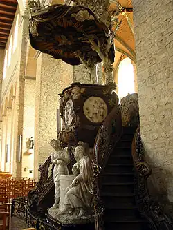 Púlpito de la verdad (1772) - púlpito de la colegiata (1772), en mármol y madera, con Jesús y la Samaritana conversando en el pozo de Jacob. Los tres medallones ilustran las parábolas del del sembrador, del hijo pródigo y del padre de familia. La superestructura de estilo barroco y las decoraciones de la barrica y las escaleras de estilo Luis XVI viven en armonía en un impresionante conjunto. Laurent Delvaux fue asistido por Philippe Lelièvre (decorador escultor) y Nicolas Bonete (ebanista);[5]: 15–6