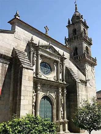 En lo que a su fachada se refiere, es una de las mejores muestras de la arquitectura y escultura renacentistas de toda Galicia. La decoración escultórica del frontón de la fachada remite a temas bíblicos —como la Anunciación— y representa también varios ángeles. Existe, una figura de un obispo. Las esculturas están dañadas por la erosión y las inclemencias meteorológicas que ha borrado los principales rasgos de las esculturas.Sobre su única puerta de entrada tiene un gran rosetón y en ambos lados unos contrafuertes. En la parte derecha de la fachada se encuentra la torre edificada durante el siglo XVIII.
