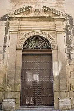Esta portada constituye el acceso meridional a la Colegiata de San Patricio, desde la Plaza de España. Fue construida en torno a 1571, y fue durante muchos años la entrada principal al templo.