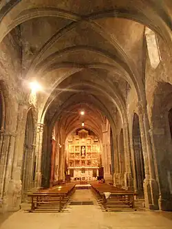 Al interior se accede a través de tres portadas, siendo la principal su portada occidental, realizada en 1412, con una abundante decoración en comparación con el sobrio interior. La portada está abocinada con arquivoltas apuntadas con capiteles decorados escultóricamente. Las jambas también poseían esculturas adosadas, pero se perdieron durante la Guerra Civil, al igual que el parteluz.[1]