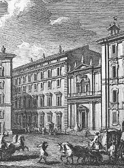 ![]() La iglesia de San Macuto seguida del palacio Gabrielli-Borromeo, sede del Colegio de Nobles (grabado de Giuseppe Vasi, mediados del siglo XVIII) | ||