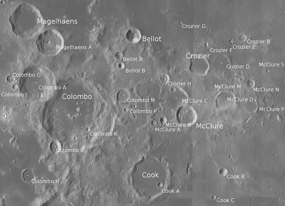 Por convención estos elementos son identificados en los mapas lunares poniendo la letra en el lado del punto medio del cráter que está más cerca de Colombo.