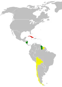 Además, durante política de detenté la URSS intervino indirectamente, bajo la apariencia de relaciones diplomáticas, préstamos o relaciones comerciales, en los gobiernos del Gobierno Revolucionario de la Fuerza Armada en Perú (1968), Juan José Torres en Bolivia (1971), Salvador Allende en Chile (1973) o Gobierno Popular Revolucionario en Granada (1979).[16][17] Algunos de los préstamos y acuerdos comerciales de exportación establecidos con estados clientes fueron con Argentina, propiciados por el peronista José Ber Gelbard (1974), o con la Unidad Popular de Chile (1972), entre otros.[18][19] El apoyo de la URSS se manifestó también en relaciones diplomáticas con Surinam tras su golpe de Estado (1980). Tras las revoluciones de 1989 Cuba se mantuvo como el único país comunista de América, siendo desde entonces China el país de mayor influencia entre los gobiernos socialistas y comunistas americanos reunidos en el Foro de Sao Paulo.[20]