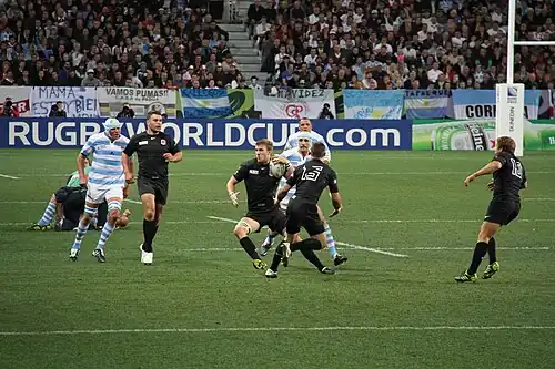 En la Copa del Mundo los conflictos de colores se deciden mediante el cara o cruz. En los cuartos de final de Francia 2007, entre Francia y Nueva Zelanda, el uniforme francés era azul oscuro y chocaba con el uniforme negro de los All Blacks: el sorteo fue a favor de Francia y Nueva Zelanda vistió la camiseta plateada.[45][46] Sin embargo, en la final de la Copa del Mundo de Rugby de 2011 entre esos equipos, Francia ganó el sorteo y eligió jugar con su uniforme blanco de visitante. El director del equipo de Francia, Jo Maso, dijo que esta decisión se debió a honrar: «La bienvenida que recibimos de la gente de Nueva Zelanda, la impecable organización del torneo y el honor y el placer de jugar en el Eden Park».[45]