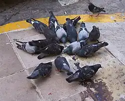 Las palomas se alimentan en el suelo en bandadas o individualmente. Cuando son molestadas las palomas alzan el vuelo en grupo con un ruidoso batir de alas característico.[19]​ Las palomas en la naturaleza son principalmente granívoras, que se alimentan de semillas de cereales, leguminosas y otras plantas herbáceas,[16]​ aunque también se alimentan de brotes, frutos, insectos, gusanos y caracoles. Normalmente las palomas beben después de haber comido, al igual que otras aves de dietas secas, aunque también consumen agua para bajar su temperatura corporal en días calurosos.[20]​ Todas las palomas se caracterizan por su forma de beber. Son capaces de tragar agua de manera continua con la cabeza agachada y el pico sumergido, a diferencia del resto de aves que tienen que levantar la cabeza e inclinarla hacia atrás para poder tragar el agua.