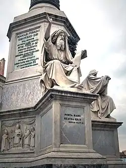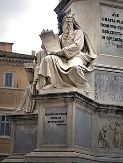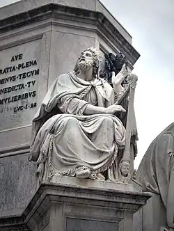 La base de mármol presenta cuatro bajorrelieves que recuerdan la Anunciación, el sueño de San José, la coronación de la Virgen y la promulgación del dogma.[1] En la base hay cuatro estatuas de figuras hebreas que presagiaban el nacimiento virginal, cada una acompañada de una cita de un versículo bíblico en latín, que incluye: