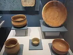 | Aguijón de cola de raya, grabado, que formaba parte del ajuar funerario de Aj Pakal Tahn. | Cabeza maya con deformación craneana. | Caracol usado para crear sonidos musicales o de guerra | Cabezas en estuco decoraban los templos. | Vasijas de barro. | |||