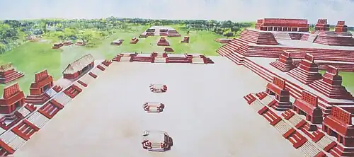Los templos y las casas habitación, fueron erigidas sobre elevaciones hechas artificialmente con tierra mezclada con cascajo de concha de ostión y recubiertas de estuco.[9]