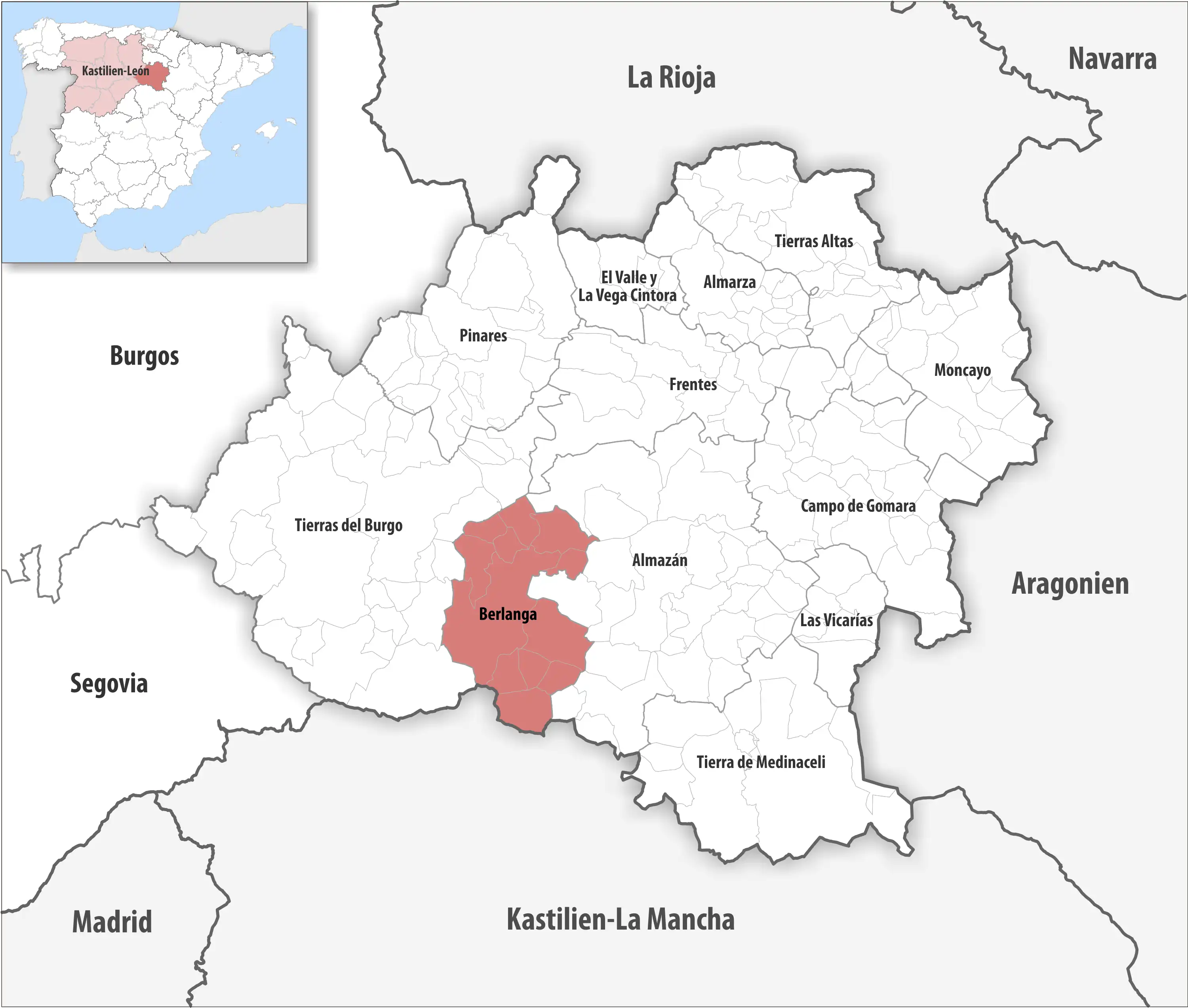 Está constituida por los pueblos pertenecientes en el Antiguo Régimen a las Comunidades de Villa y Tierra de Berlanga y de Fuentepinilla, más los pueblos de Rello y Barcones, el primero por haber pertenecido a la primitiva Comunidad de Berlanga, mientras que fue de realengo, y el segundo por tratarse de un pueblo de confín, que tras su pertenencia a las Comunidades de Atienza y Paredes se quedó desgajado, como isla a la deriva, al configurarse las nuevas provincias en 1833. Añadimos a la lista la aldea de Valverde de los Ajos, pues si bien está clara su pertenencia histórica a la Tierra de Osma, en los últimos tiempos ha sido agregada al municipio de Bayubas de Arriba.