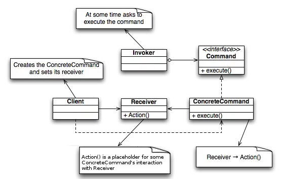 Este patrón permite solicitar una operación a un objeto sin conocer realmente el contenido de esta operación, ni el receptor real de la misma. Para ello se encapsula la petición como un objeto, con lo que además facilita la parametrización de los métodos.