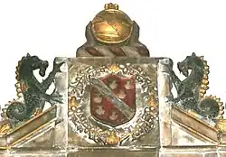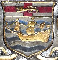 - ↑ El jefe es idéntico, pero el campo (el mar) se muestra aquí como «barry ondulado de nueve plata y azul» (quizás idéntico a «un mar propiamente dicho») y algunas de las cargas no son visibles, como la cabeza del delfín.