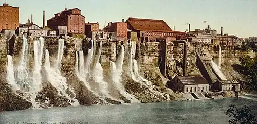 - ↑ «Niagara Falls Frequently Asked Questions». Archivado desde el original el 14 de julio de 2011. Consultado el 11 de marzo de 2011. «Aunque los molinos han estado utilizando agua desviada de las cataratas como fuente de energía hidráulica desde 1759, no fue hasta 1882 cuando las cataratas se utilizaron para generar electricidad. Niagara Falls Hydraulic Power & Manufacturing Company, que construyó un canal para la generación de energía hidráulica hace casi 20 años, comenzó a operar una pequeña planta eléctrica en Niagara Falls, Nueva York en 1882. La planta, que generaba corriente continua (CC), podía distribuir la corriente a una distancia máxima de tan solo 2 millas. A pesar de esta limitación, fue un gran éxito tanto por su utilidad como por ser una atracción turística. Fue esta pequeña planta la que demostró el potencial de la energía hidroeléctrica de las Cataratas del Niágara. ...»