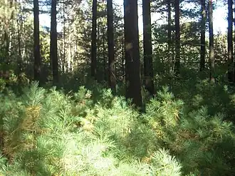 Los organismos pueden competir indirectamente por medio de la competencia por explotación o la competencia evidente. La competencia por explotación se produce cuando los individuos merman el recurso que comparten y por ello todos terminan disminuyendo su aptitud, aunque resultan victoriosos los más resistentes o los que más recursos consigan encontrar o alcanzar. Estos organismos puede que no lleguen a estar nunca en contacto, sino que la interacción se produce de forma indirecta por medio del recurso compartido. En los organismos estáticos como las plantas, la competición por explotación desempeña un papel más importante que la competición por interferencia, y al estar enraizadas en un área determinada solo pueden utilizar los recursos de su entorno inmediato sin poder emigrar como los animales. Los retoños compiten por la luz, y la mayoría serán bloqueados y desbancados por los árboles más altos.[7] Los retoños son superados fácilmente por los adultos de su propia especie, por lo que es tan importante que la dispersión de las semillas se produzca a distancias largas, ya que una semilla que germine demasiado cerca de sus padres es muy probable que quede en la sombra y muera.