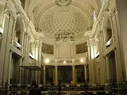 El oratorio, a la derecha del complejo, utilizado antiguamente como sala de audiencias del Tribunal, tiene en su techo un fresco con la Asunción de la Virgen de Giuliano Traballesi, que data de 1775. Su interior está rodeado por palcos en las exedras y a lo largo de las paredes laterales, sostenidos por elegantes columnas de orden jónico. Se trata de coros que recuerdan la función principal de la estancia, donde los padres filipenses se dedicaban sobre todo al canto de laudas. El oratorio era por tanto una especie de «auditorio» de música sacra que, según los preceptos de san Felipe Neri, constituía una de las ocupaciones principales de los padres, que por esto también fueron llamados «oratorianos».