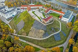 ![]() Vista aérea del castillo Superior con la torre de Gediminas y el castillo Inferior con el palacio de los Grandes Duques de Lituania (izquierda) y los arsenales (Museo Nacional de Lituania y Museo de Artes Aplicadas). | ||