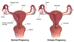 El embarazo es el desarrollo de un embrión o feto dentro del útero de una mujer durante un período aproximado de 9 meses o 40 semanas desde el último período menstrual hasta el nacimiento.[31] Se divide en tres trimestres, cada uno con una duración de aproximadamente 3 meses. El primer trimestre es cuando el embrión en desarrollo se convierte en feto, los órganos comienzan a desarrollarse, las extremidades crecen y aparecen los rasgos faciales.[32] El segundo y tercer trimestre están marcados por una cantidad significativa de crecimiento y desarrollo funcional del cuerpo. Durante este tiempo, el cuerpo de la mujer sufre una serie de cambios y pueden surgir muchas complicaciones que involucren al feto, a la madre o ambos.[33]