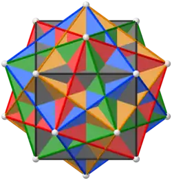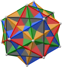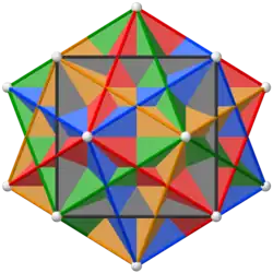 El compuesto es un facetado de un dodecaedro (donde se pueden ver pentagramas en correlación con las caras pentagonales). Cada cubo representa una selección de 8 de los 20 vértices del dodecaedro.