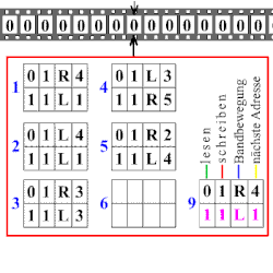 Esta tabla toma como parámetros el estado actual de la máquina y el carácter leído de la cinta, dando la dirección para mover el cabezal, el nuevo estado de la máquina y el valor a escribir en la cinta.