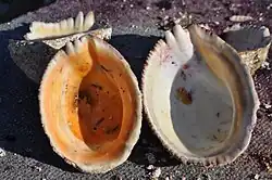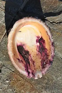 La concha pateliforme es dura, de paredes gruesas. En torno a su vértice, ubicado hacia la izquierda en la parte posterior, se conforma una espiral de tres vueltas, las que solo son claramente distinguibles en los ejemplares más jóvenes, puesto que es la tercera vuelta la que crece para constituir la concha adulta y las otras dos vueltas originales ya no se aprecian.[2] Externamente, su superficie convexa es rugosa y de color grisáceo con visos amarillo arena. Está cubierta de estrías que van desde el vértice hasta los bordes, las que a su vez están cortadas transversalmente formando un patrón complejo en su textura. Algunas de estas estrías son claramente más pronunciadas y forman surcos profundos. Una de ellas permite la salida del sifón y otras dos terminan en el borde anterior en una suerte de "dientes" que tienen la funcionalidad separar y dar espacio a la salida de los tentáculos retráctiles, provistos de los ojos del animal.[6] Los patrones de estrías en la concha son más fácilmente observables en los individuos jóvenes, puesto que generalmente la concha de los adultos está cubierta de muchos parásitos y algas que impiden apreciar los detalles estructurales. Incluso se pueden ver a veces pequeñísimos ejemplares de la misma especie adosados a las conchas de los adultos, circunstancia que se ha aprovechado para algunos experimentos de cultivo.[7] En su cara interior muestra una superficie muy pulida, lisa y nacarada con colores que varían desde el blanco lechoso hacia tonalidades del rosa, amarillo y naranja.[5]